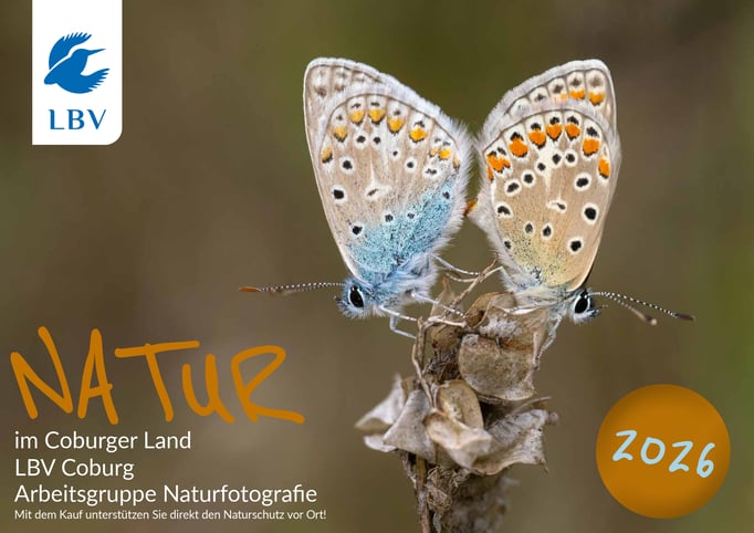 Der Naturkalender in DINA3 wird von unserer Arbeitsgruppe Naturfotografie erstellt, wobei die Fotografen ihre Fotos spenden. Der Erlös aus den verkauften Kalendern kommt unserer Naturschutzarbeit im Coburger Land zugute. Der Kalender kann auch zweiseitig aufgehängt werden (als Format A2).